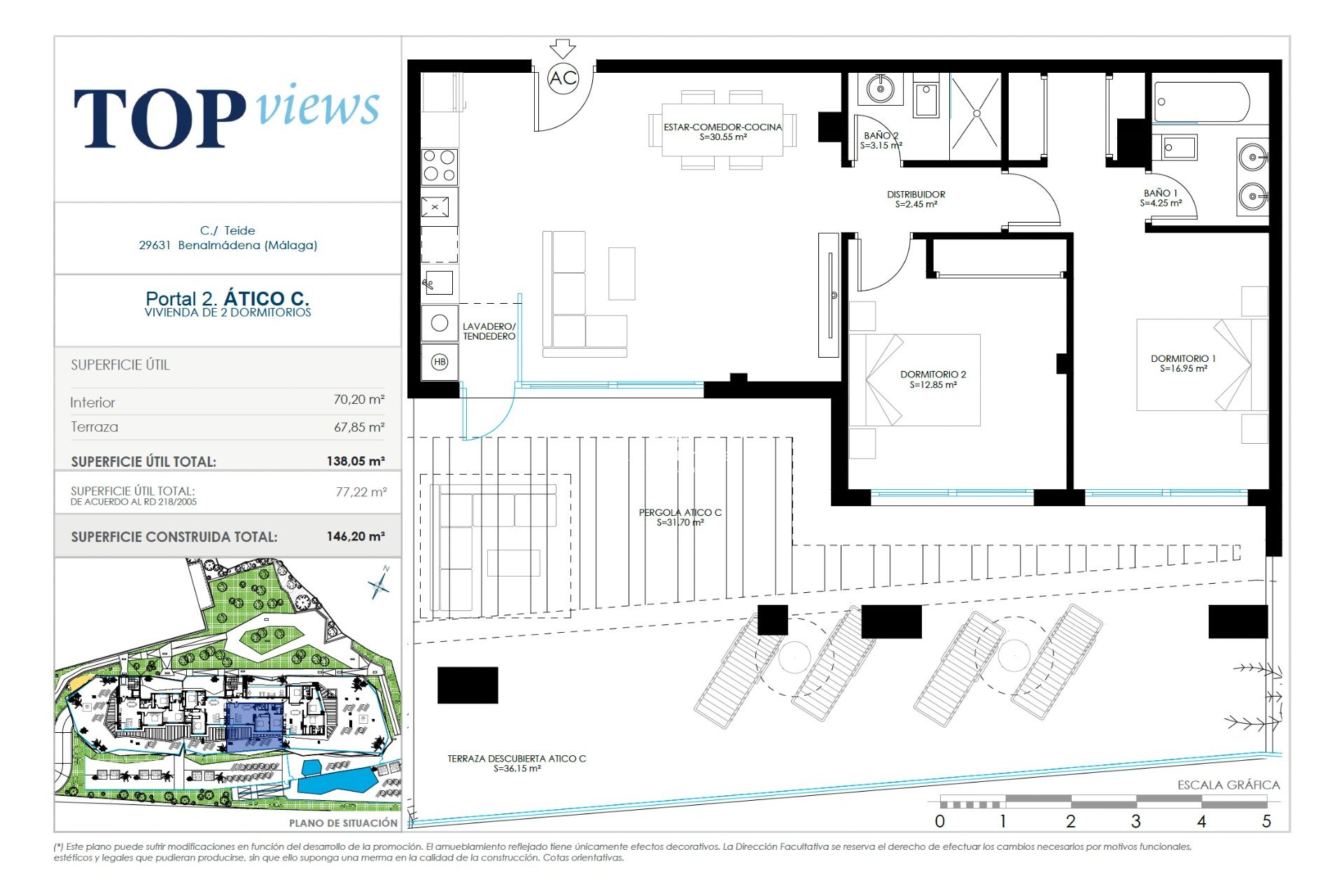 La vivienda cuenta con 146 m² construidos y una amplia terraza de 68 m², perfecta para disfrutar del clima de la Costa del Sol, relajarse al aire libre y aprovechar las vistas panorámicas que caracterizan a esta promoción.
